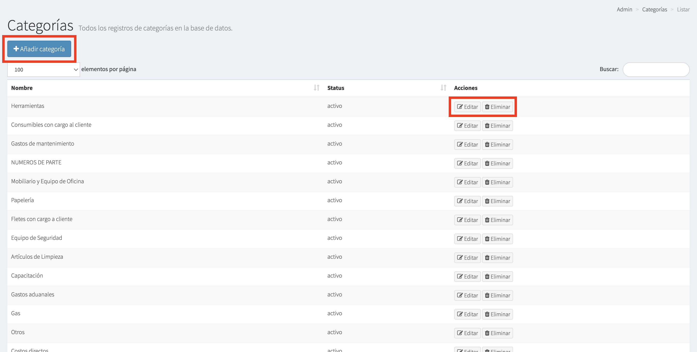 1.- Al momento de dar click en Categorías, nos aparecerá la siguiente pantalla con los siguientes botones: