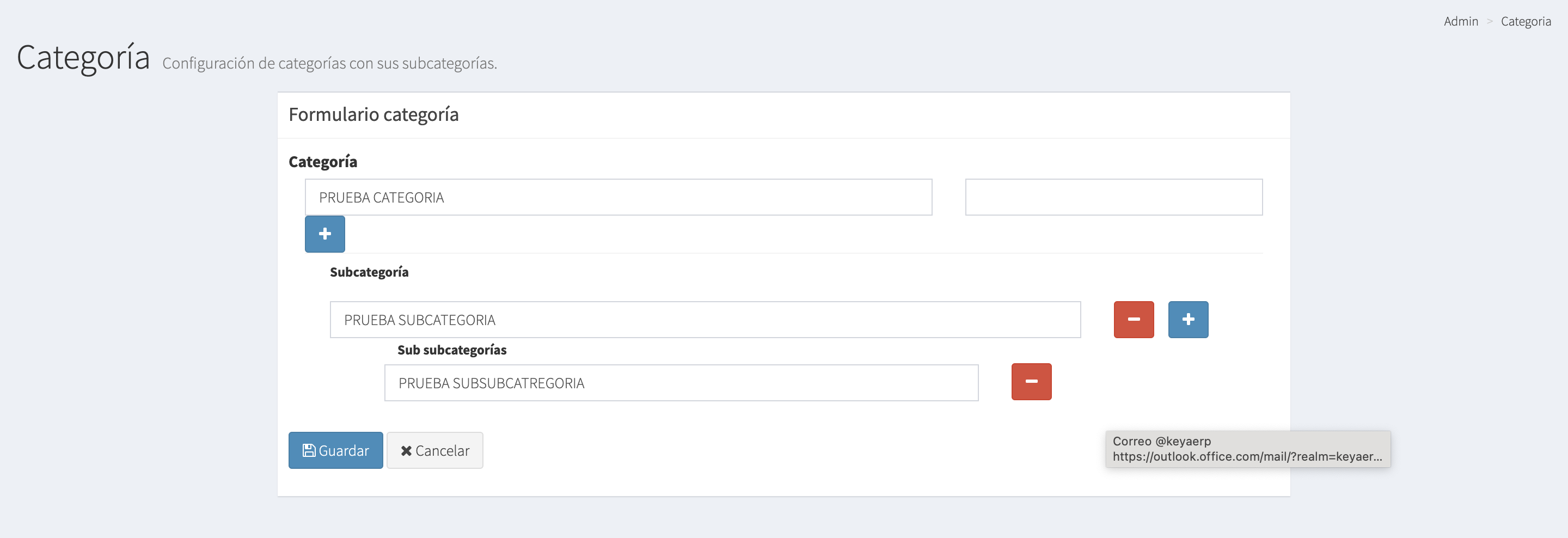 ó también eliminar la SubCategoría y SubSubCategoría haciendo uso del botón -> - . Una vez que terminemos de configurar, le daremos click al botón Guardar.