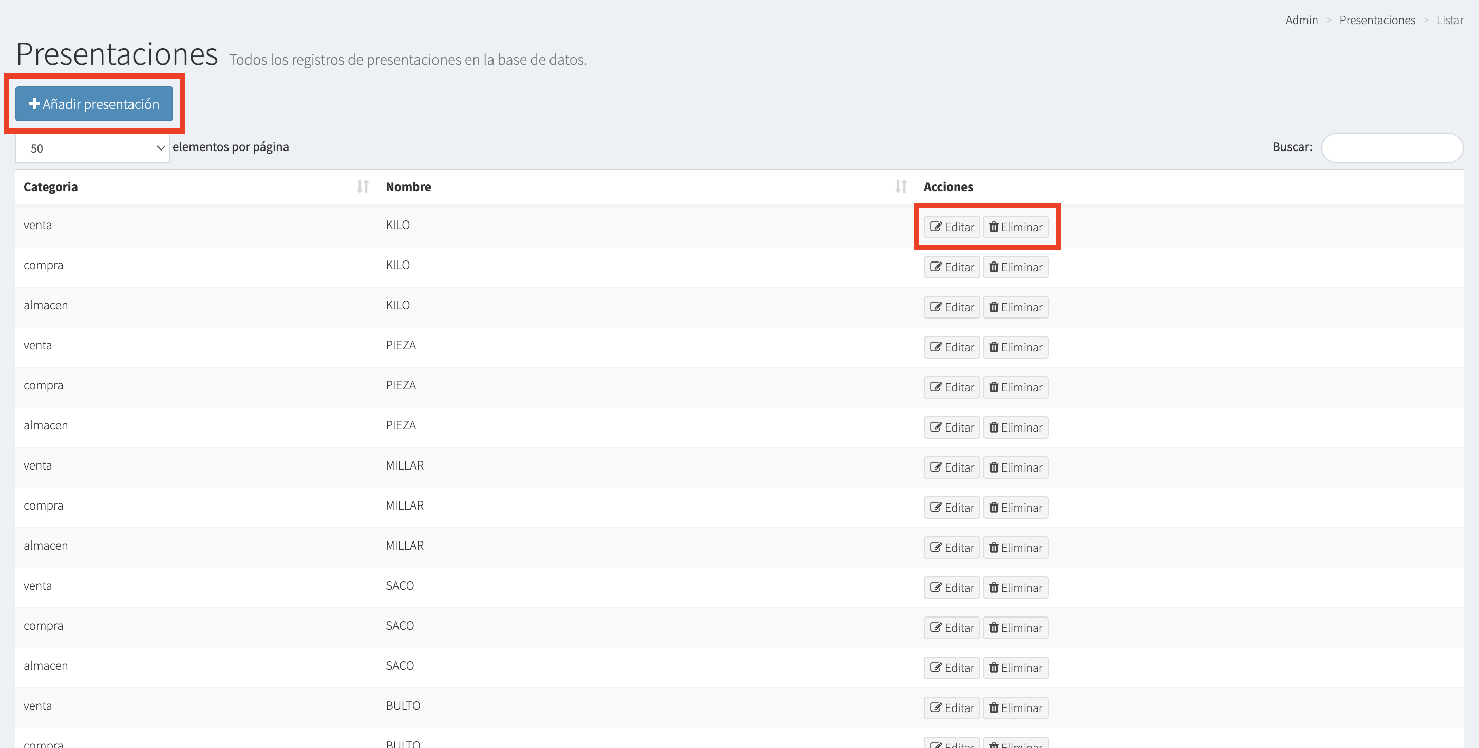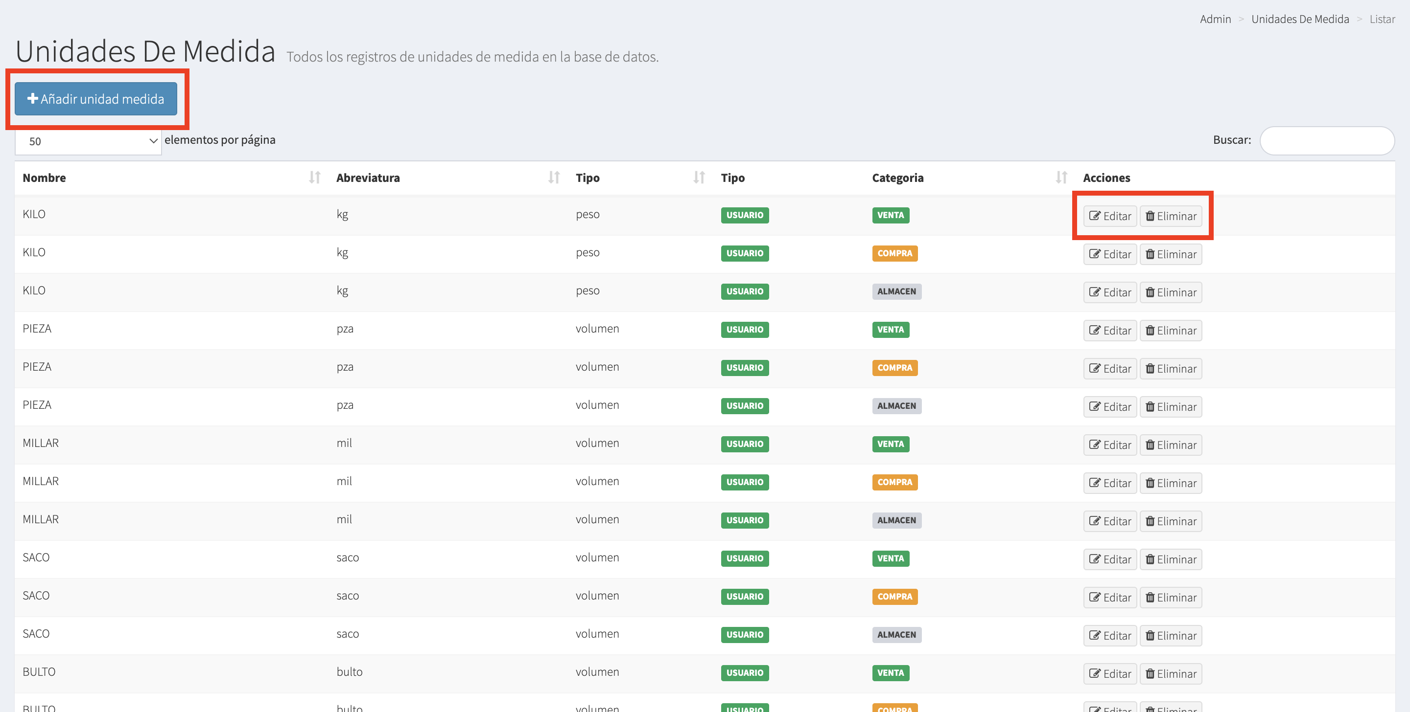 b) Eliminar - Esta opción te permite eliminar la unidad de medida.