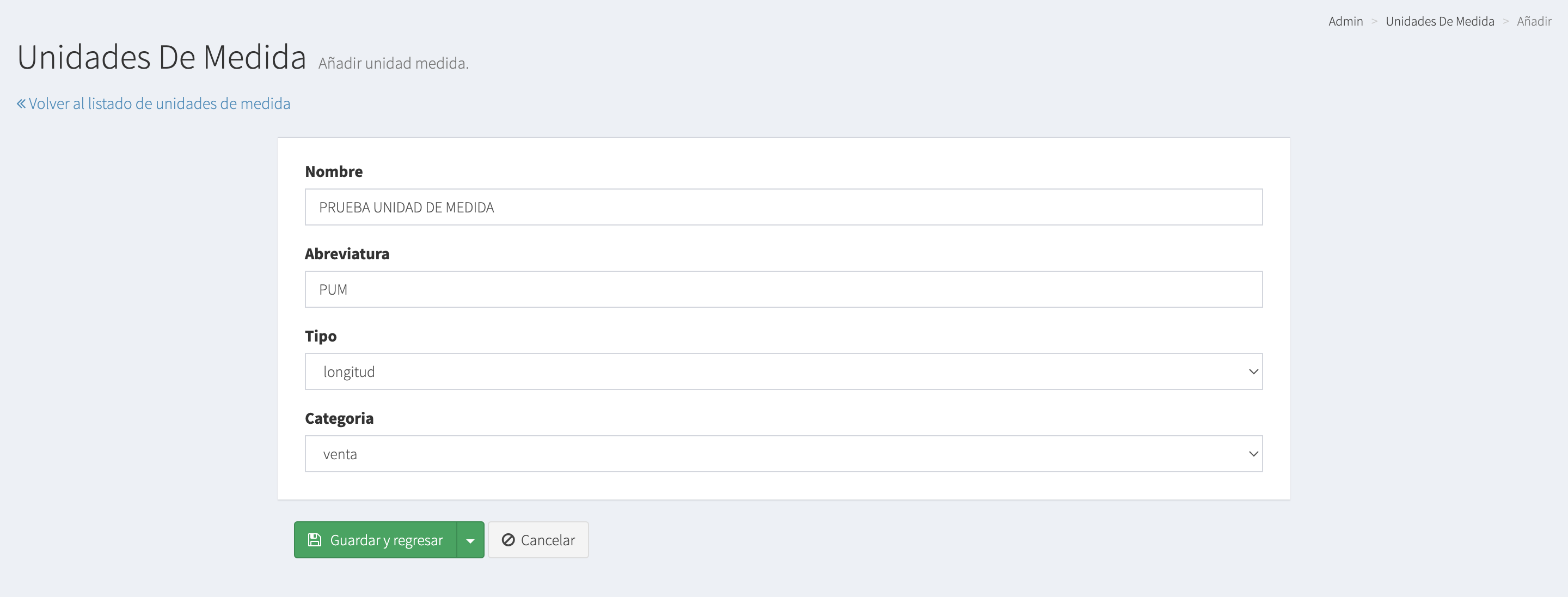 2.- Para dar de alta una nueva Unidad de Medida, tenemos que darle click al botón + Añadir unidad medida y se nos abrirá la siguiente pantalla.