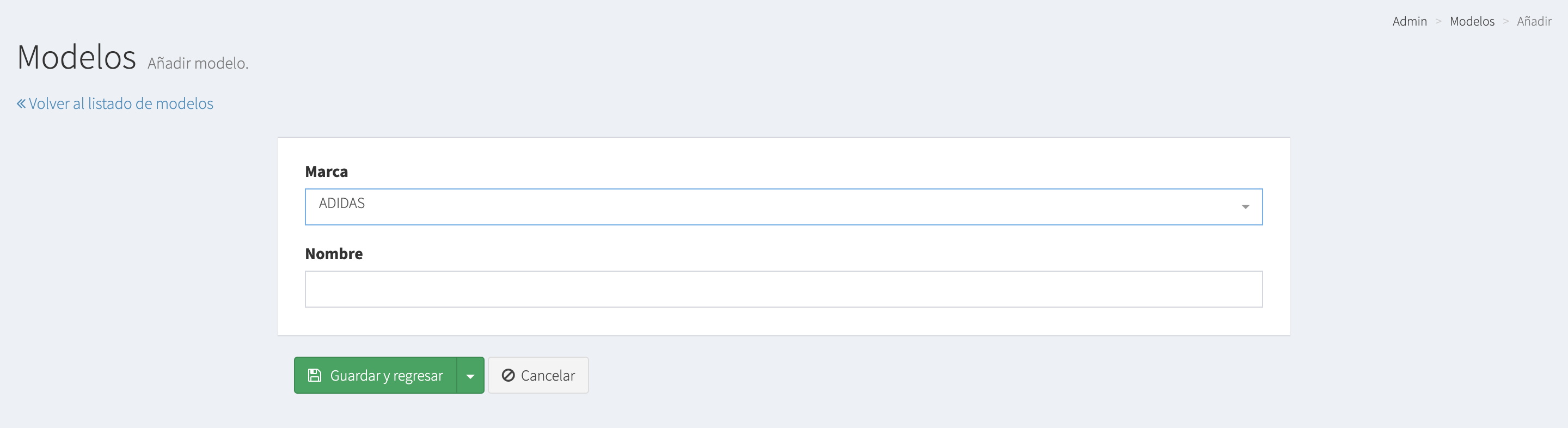 2.- Para dar de alta un nuevo Modelo, tenemos que darle click al botón + Añadir modelo y se nos abrirá la siguiente pantalla.